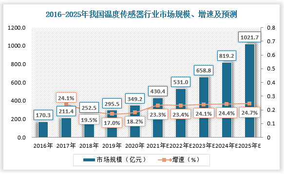 数据显示,2016年-2020年,我国温度传感器行业市场规模由170.3亿元增长至349.2亿元,预计2025年将达到1021.7亿元。