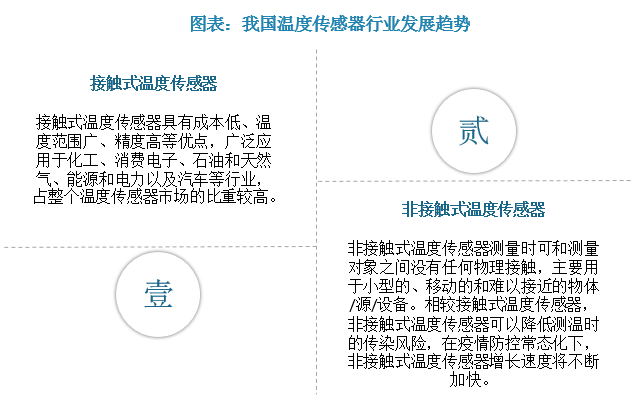 细分来看,温度传感器分为接触式温度传感器和非接触式温度传感器。接触式温度传感器具有成本低、温度范围广、精度高等优点,广泛应用于化工、消费电子、石油和天然气、能源和电力以及汽车等行业,占整个温度传感器市场的比重较高。非接触式温度传感器测量时可和测量对象之间没有任何物理接触,主要用于小型的、移动的和难以接近的物体/源/设备。相较接触式温度传感器,非接触式温度传感器可以降低测温时的传染风险,在疫情防控常态化下,非接触式温度传感器增长速度将不断加快。