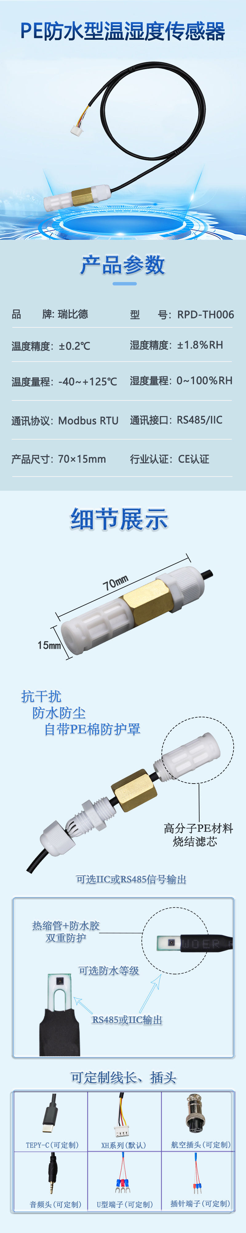 PE温湿度传感器探头,是指其外部保护壳或探头主体采用PE(聚乙烯)塑料制成的传感元件。它特别强调“防水防尘” 特性,通常通过一体注塑成型等工艺实现,其设计目标是应对比标准PVC探头更潮湿、多尘的环境,同时保持比金属探头更低的成本和更轻的重量。