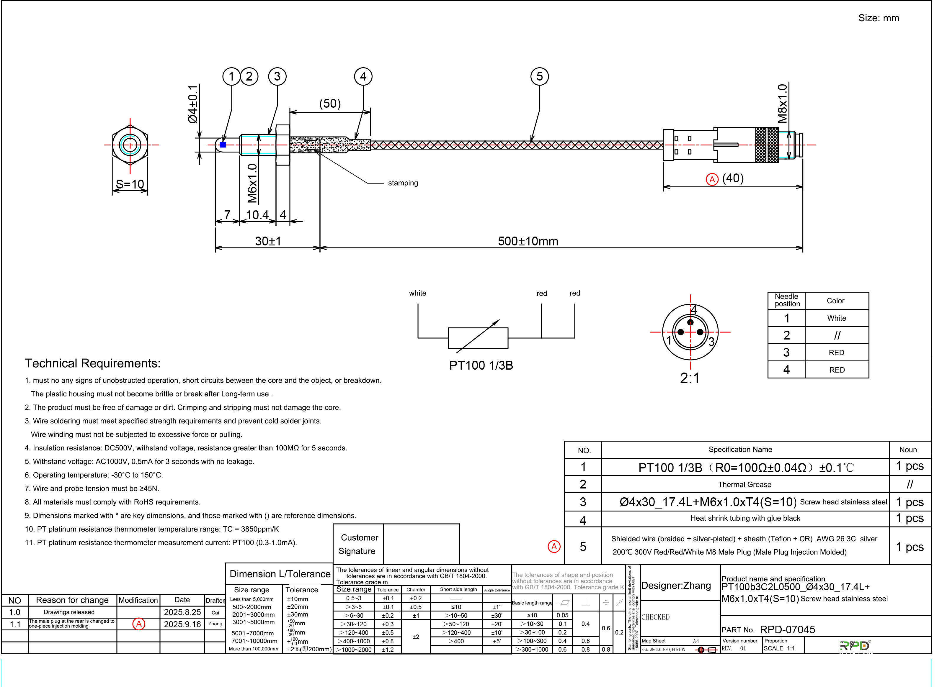 200°℃ 300V Red/Red/White M8 Male Plug (Male Plug Injection Molded)