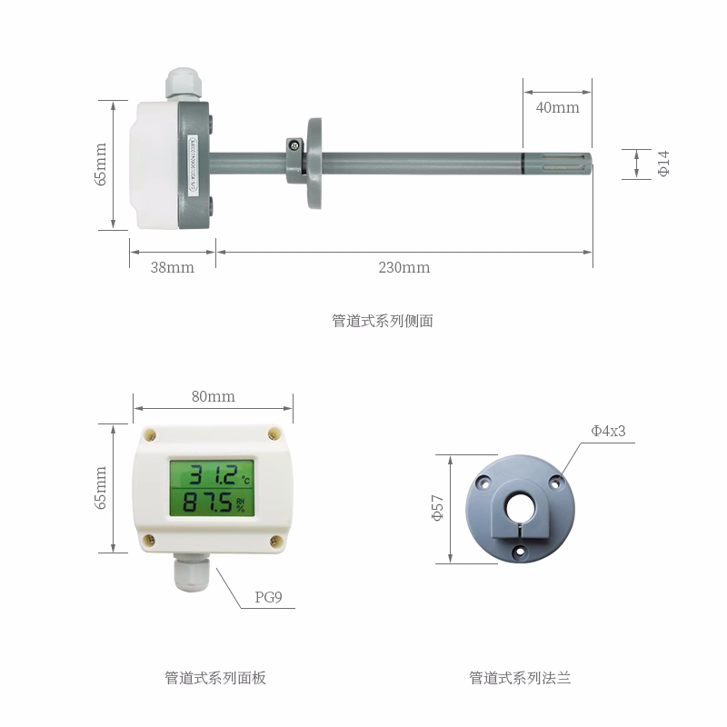 • 传感部分(温湿度探头)伸入管道内部,直接接触流动的空气。