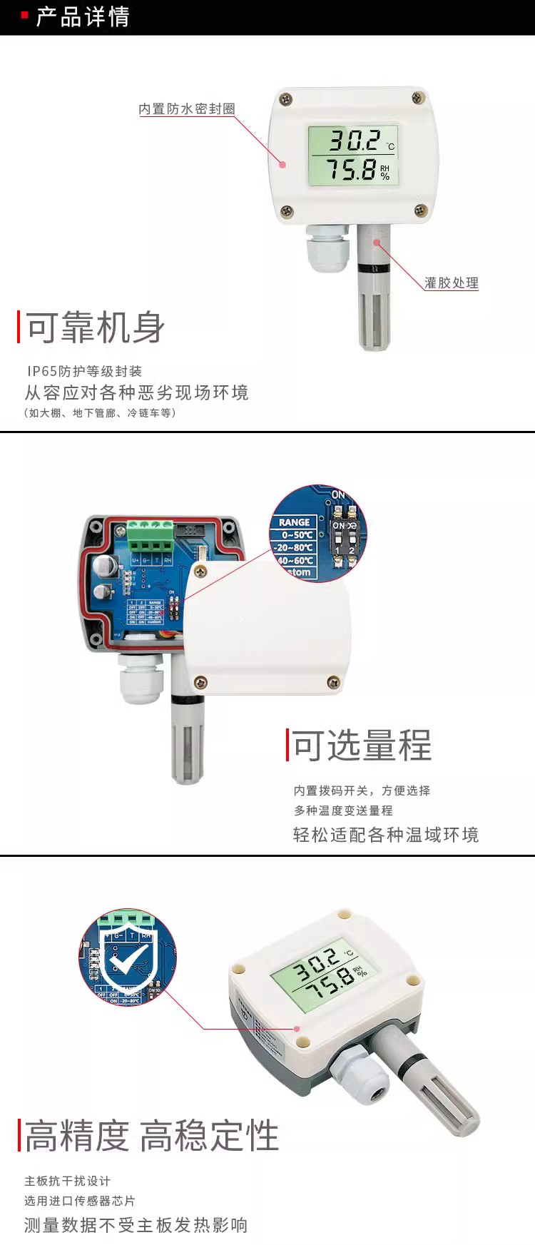 精度:根据应用场景选择。常规应用可选温度±0.5℃、湿度±3%RH;高精度场合适用温度±0.3℃、湿度±2%RH。